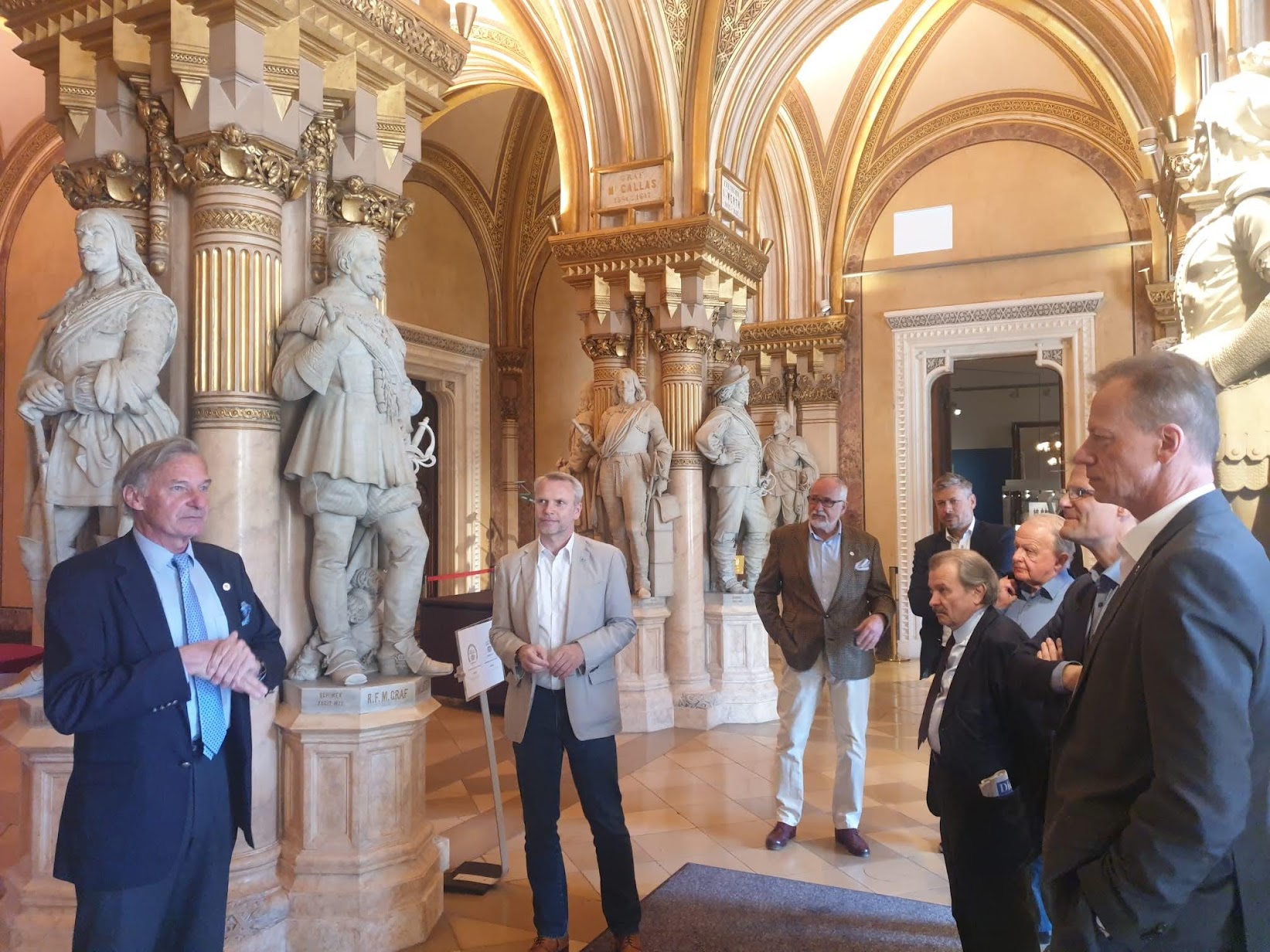Zum Abschluss ließen wir den Abend gemütlich in der prächtigen Eingangshalle des Museums umringt von Statuen arrivierter Feldherren der letzten Jahrhunderte bei Sekt und Canapés ausklingen. Als kleiner Tipp noch für diejenigen, die bedauerlicherweise nicht dabei waren: auch ein „normaler“ Besuch ist wirklich seine Zeit wert; die ausgestellten Stücke reichen vom originalen Gräf & Stift Fahrzeug (damaliger Besitzer war Graf von Harrach) vom Attentat in Sarajevo, der Uniform des Erzherzogs Franz Ferdinand an eben jenem Tag, bis hin zum prunkvollen Marschallstab des Feldmarschalls Graf Conrad von Hötzendorf sowie zwei Werke von Egon Schiele. Man kann sich in diesen altehrwürdigen Hallen nur verlieren….