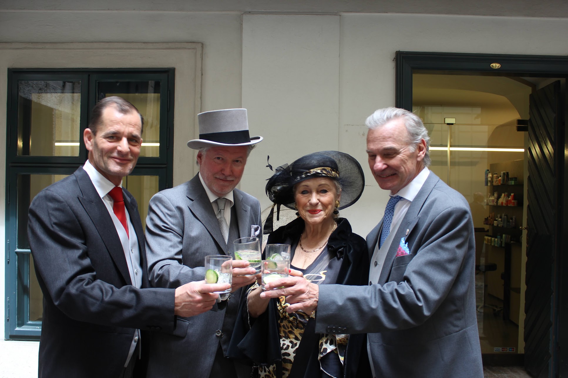 Als ich mich so gegen Ende der Veranstaltung auf die gegenüberliegende Straßenseite vor dem großen Tor begab, um noch zu fotografieren, erspähte ich zu meiner Überraschung und großen Freude Ihre Kaiserlichen Hoheiten Herta Margarete und Sandor von Habsburg-Lothringen, ein Treffen, das ich einfach fotografisch verewigen musste! Ein würdevoller Abschluss unserer Party.