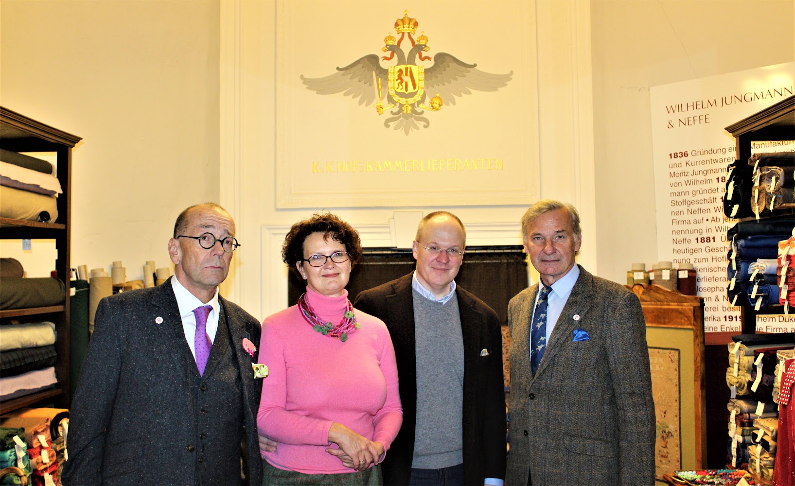 Die Stoffe kommen aus England und Italien. Hier im Geschäft gibt es zwei goldene Regeln: keine Kunstfasern und nur hochwertige Stoffe aus Europa, eben hauptsächlich England und Italien und ein bisschen Leinen aus Österreich. Georg Gaugusch klärt uns über den weltberühmten Harris Tweed auf und Dr. Marie-Theres Arnbom erklärt uns wie der „harte“ Cashmere zum „flauschigen“ Cashmere wird: Der steinharte Cashmere wird über Bretter mit unzähligen Disteln darüber gezogen und somit aufgeraut, bis er „kuschelig“ wird.