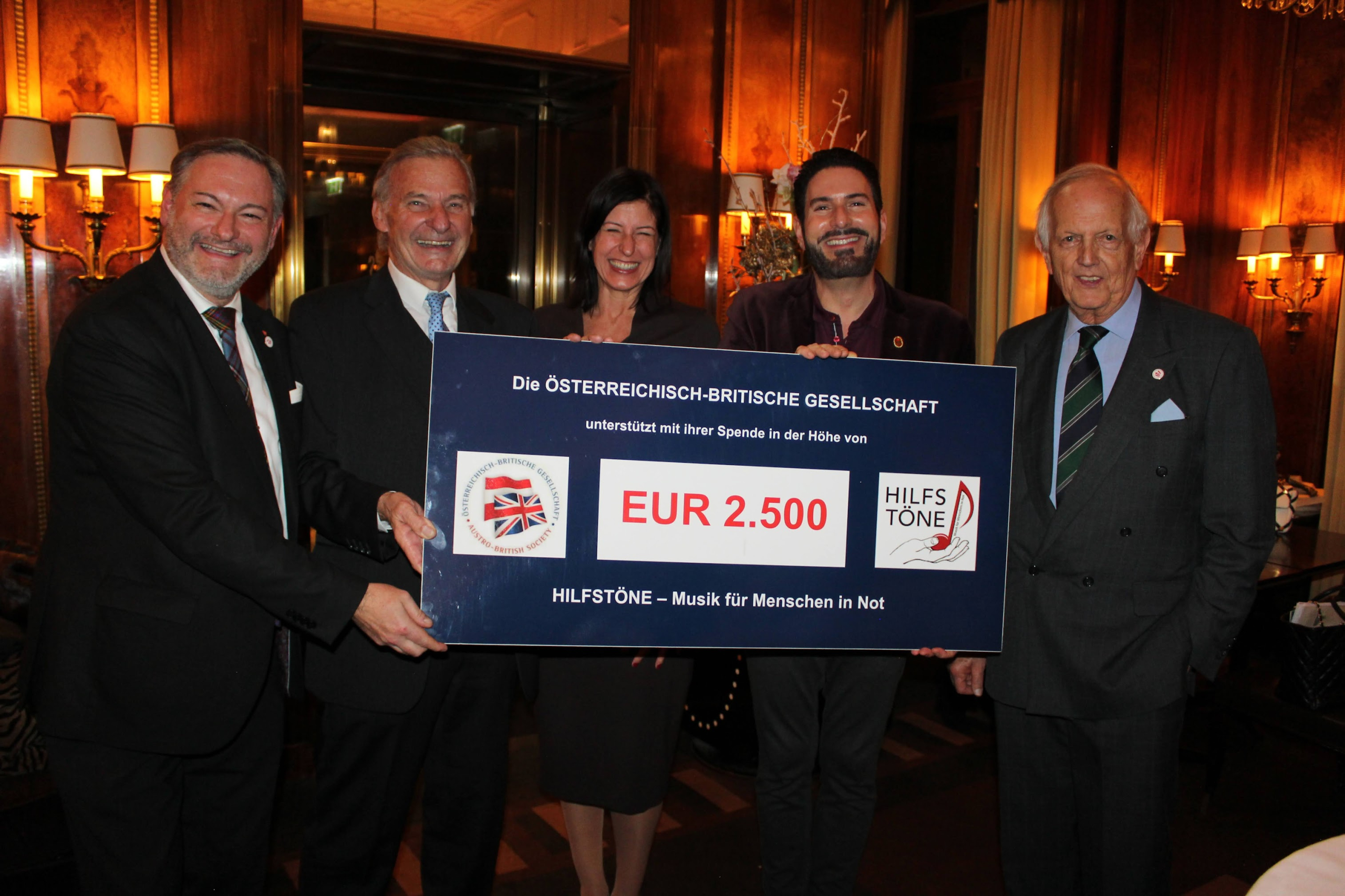 Das beeindruckende Konzert endete mit einem noblen und gleichzeitig gemütlichen Empfang im Hotel Bristol, einem weiteren Corporate Member. Präsident Prof. Dr. Kurt Tiroch überreichte stolz im Namen der ABS einen obligaten Scheck für €2.500 als langjährige Unterstützung für die HILFSTÖNE. Clemens Unterreiner dankte in seiner Rede unserem Präsidenten, den Mitgliedern der Österreichisch-Britischen Gesellschaft und seinen Künstlerkollegen. Seine Rede kann über den YouTube-Link HIER eingesehen werden. Gerade als ich den Film beenden wollte, hob Prof. Dr. Tiroch seine Hand und rief: „Und das Beste kommt zuletzt, das Büffet, das es nicht gibt, ist eröffnet!“ Prof. Dr. Tiroch hatte die Lacher auf seiner Seite!